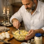 מכיוון שהמיונז מדבק את הביצים כעין עיסה, יש אומרים שיקלף סמוך לסעודה וירסק בשיני המזלג וישנה מהסדר הרגיל ובכך יהיה מותר: א. לצורך אותה סעודה. ב. הוא אינו מפורר את הביצים כקמח. ג. כיון שרוצים רק לערבב ומקפידים שלא יתהוו ממש גוש אחד (שש"כ ח, כא). יש מתירים אם הדבר שמערבים בו מיונז הוא רטוב כעין חריין שמוכרים בחנויות, מכיוון שכולו משקה, וגם בתפוח אדמה שהוא יבש, ויש כאן בלילה עבה, יהיה מותר בשינוי ממה שרגילים להכניס ראשונה, וגם בצורת הערבוב, מכיוון שהטעם נפגם אם מכינים מערב שבת (אבני ישפה ו, עג). ולדעת השלחן ערוך מותר לתת מיונז עם הסלט ולערבבו כדי לאכול מיד (חזו"ע ד, עמ' רפב). _לפענ"ד, מותר לתת מיונז עם הסלט ולערבבו כדי לאוכלו מיד (הרב הלוי)._